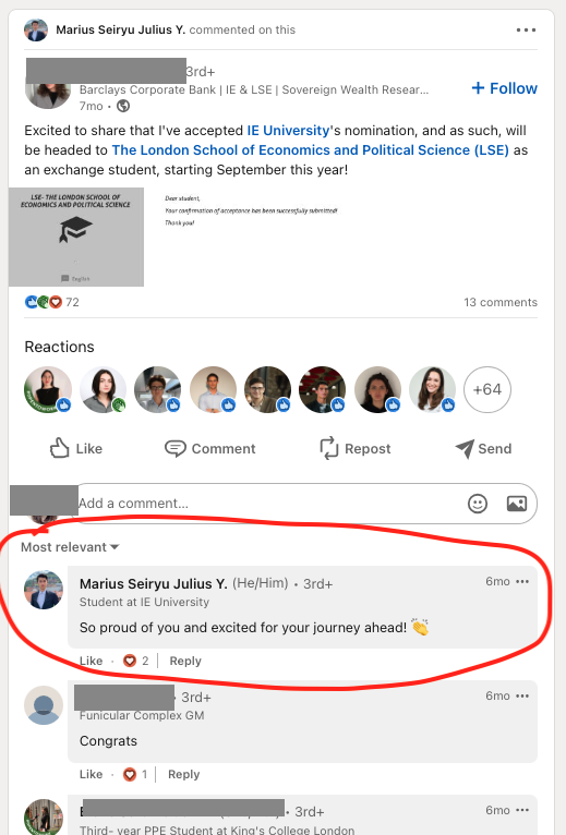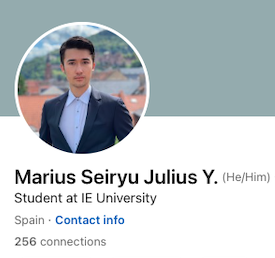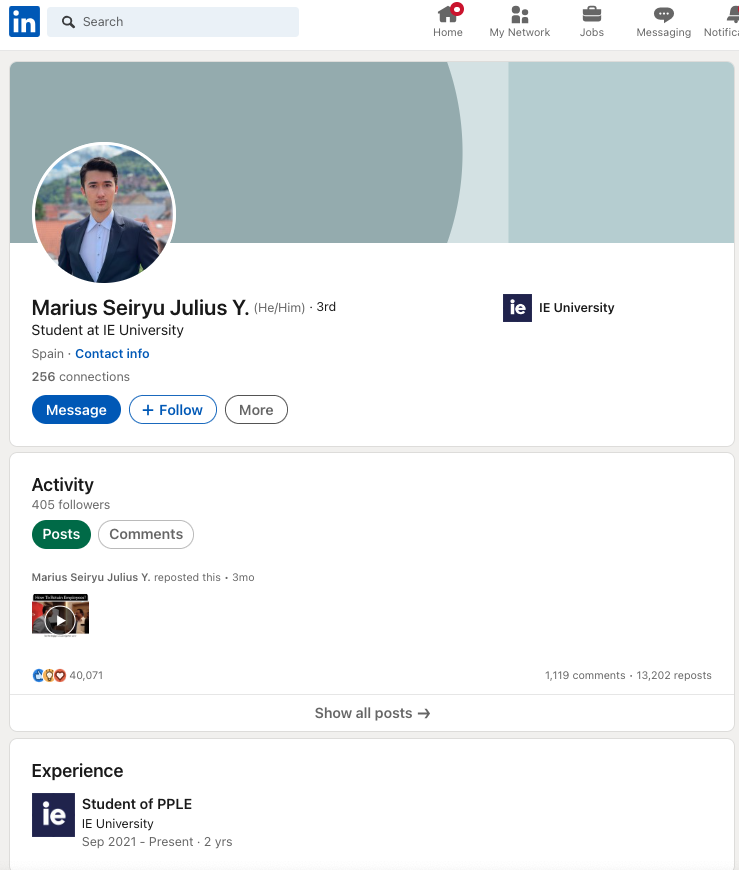 写真もばっちりマリウスですね。簡単に説明すると、現在IE Universityの学生。コネクション(他SNSでいうフレンドのようなもの)が256人。フォロワーが405人。linkedinのアカウントがあれば、誰でも普通にメッセージも送れますね。