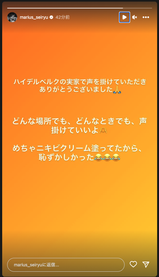お母様はこんな風に書いていらっしゃいますが、なんと、今からほんの45分ほど前、マリウスはインスタのストーリーで、このことについて触れています。ストーリーは24時間すると消えてしまうのでスクショをどうぞ。